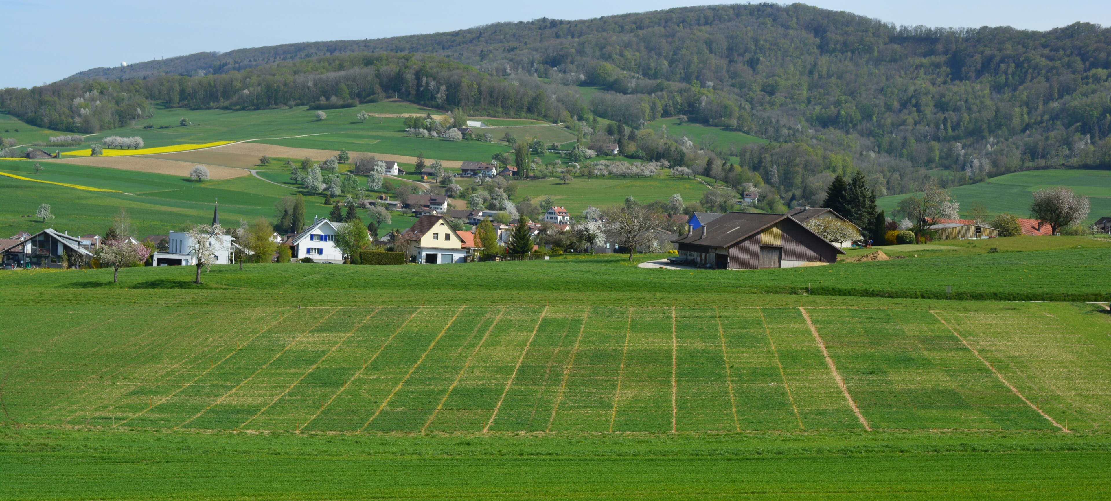 CoFEE trial with winter wheat growing in spring. The varying fertilizer levels are clearly visible by eye. Foto: © Alain Valzano-Held 2020