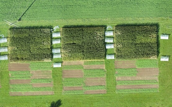 Figure 1: Agroecology: The farming systems and Tillage experiment at Agroscope. In this experiment, we investigate the agronomic, environmental and economic performance of the main Swiss arable farming systems (organic agriculture, conventional agricultural and conservation agriculture with reduced (organic systems) or no tillage (conventional systems where herbicides (e.g. glyphosate) are used to control weeds)). Together with a wide range of partners we investigate the effects of these arable farming systems on plant yield, soil biodiversity, soil and root microbiomes, nutrient cycling, soil erosion, soil structure, global warming potential, soil carbon sequestration, disease suppressiveness. Photo Raphael Wittwer.