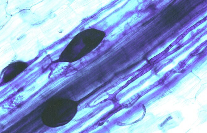 Figure 2: Symbiotic Associations: Plant root colonized by arbuscular mycorrhizal fungi (blue). 150x. Photo Marcel van der Heijden.